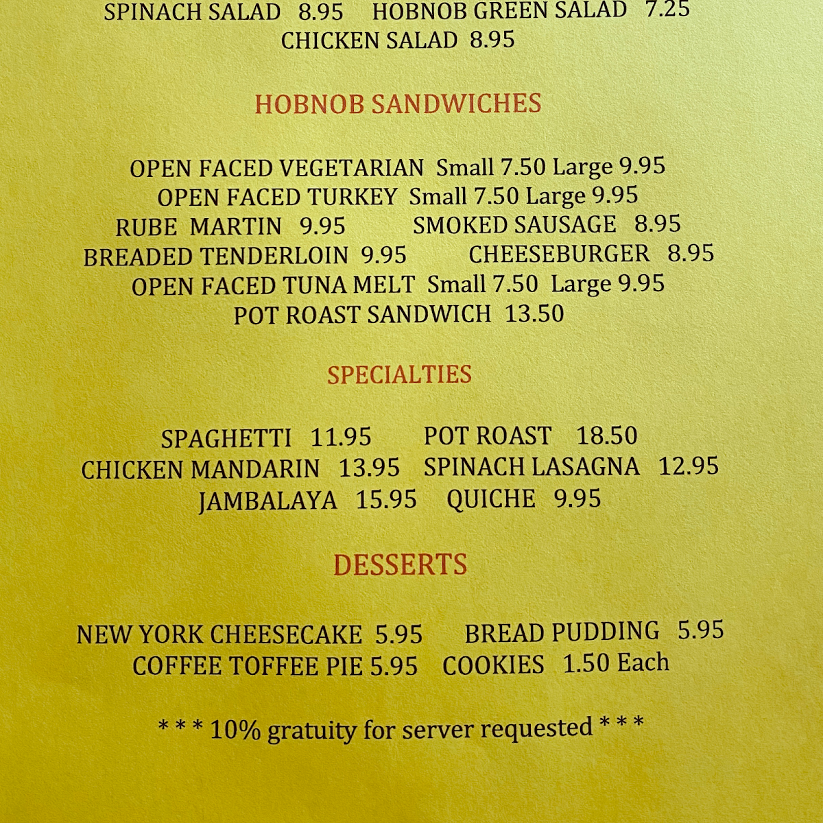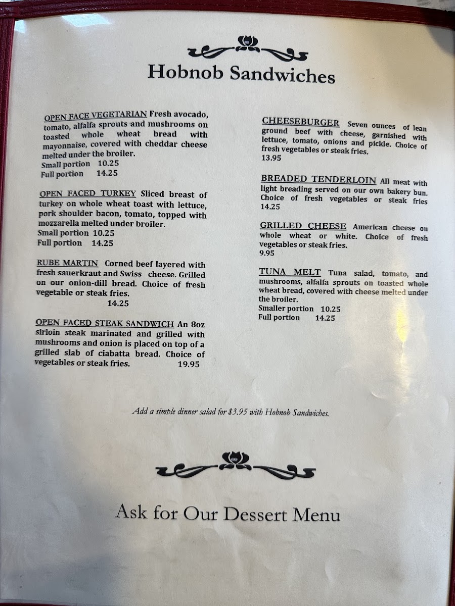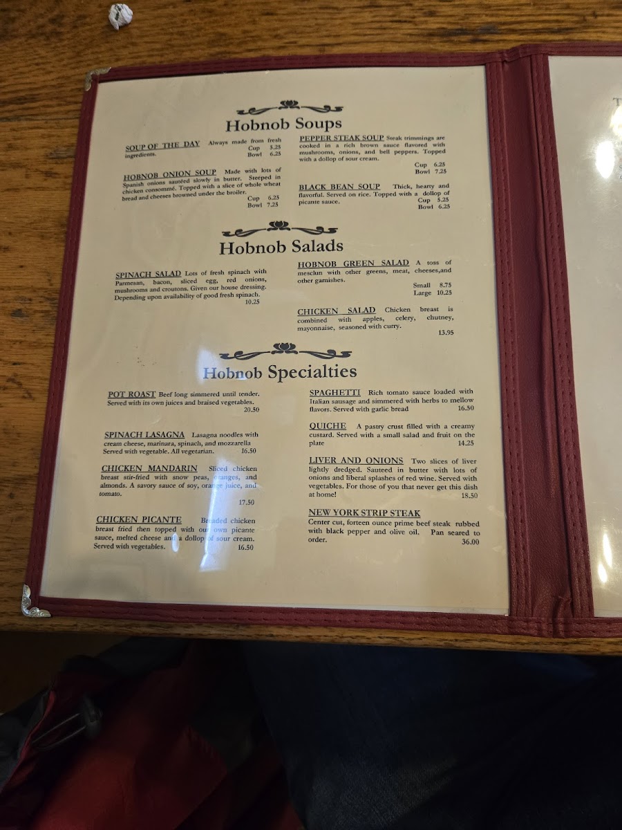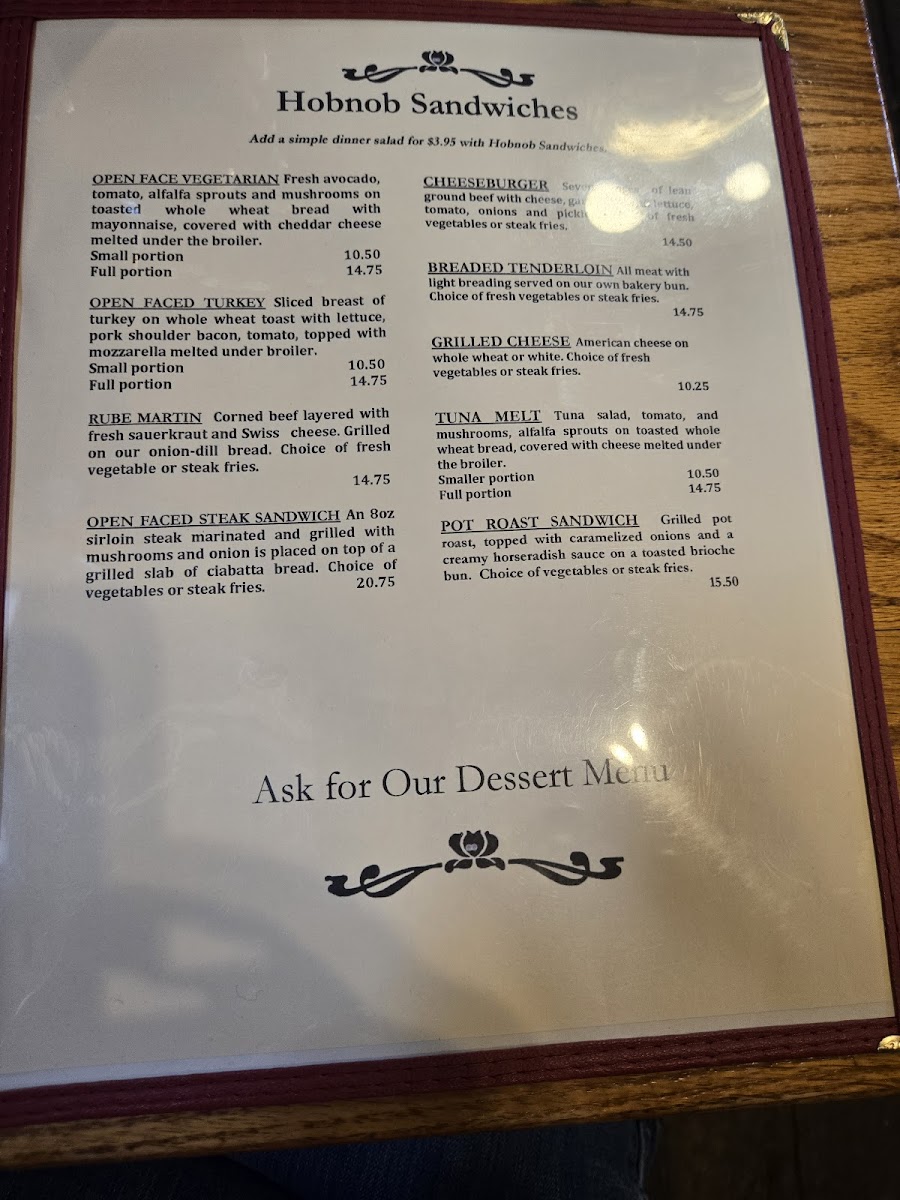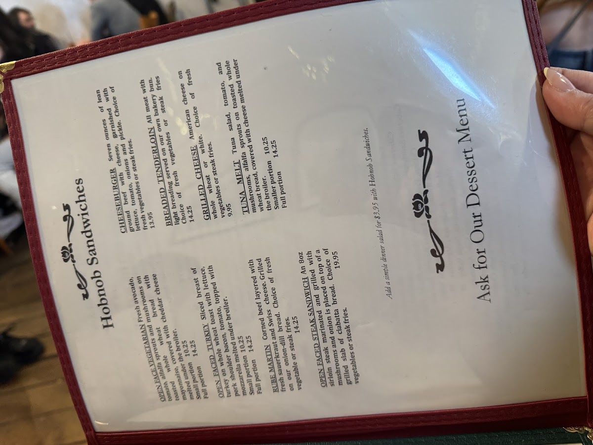 Hobnob Corner offers a thoughtfully crafted menu that embraces classic American comfort with a touch of rustic charm. The menu features familiar favorites that suit any time of day, whether you're settling in for a hearty breakfast, a casual lunch, or a relaxed dinner. Expect satisfying plates like open-face sandwiches, pot roast, and house-made biscuits and gravy that highlight simple, well-prepared ingredients.